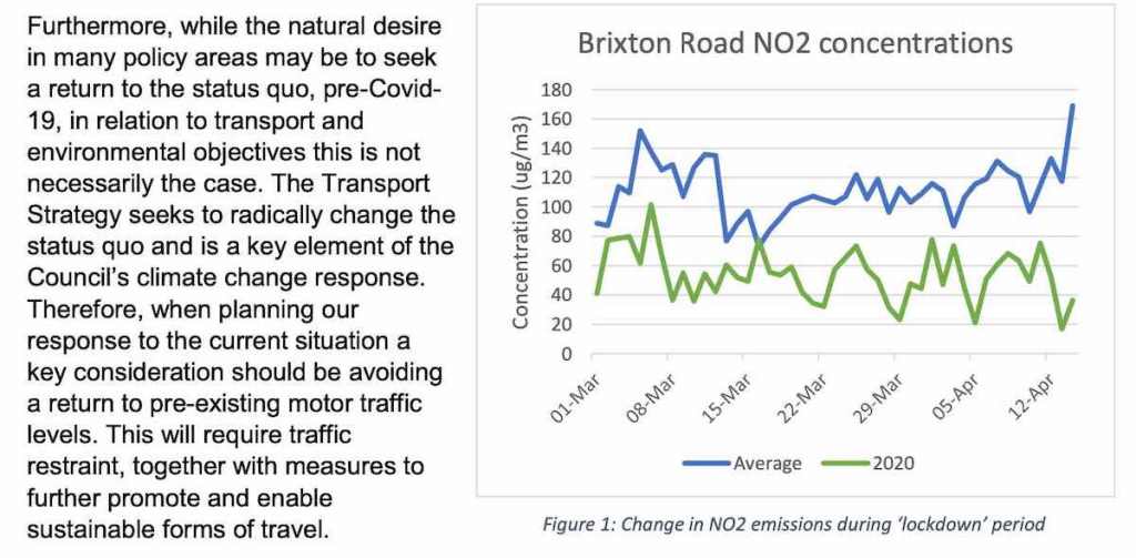 But now we’ve seen an explicit pledge on traffic reduction – Lambeth were the first borough in London to sign up to the LCC’s ‘Turning the Traffic Tide’ campaign and commit to keeping Lambeth’s traffic below pre-COVID19 levels and directly linking this to the council’s climate change commitments:
