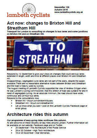 The Lambeth Cyclists newsletter contains details of local Lambeth cycling news and developments, forthcoming events and other information of interest to cyclists in the borough.